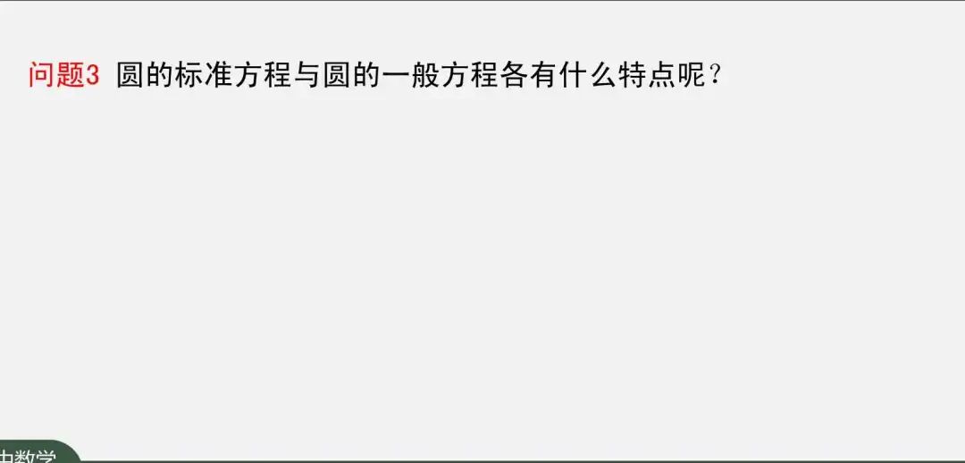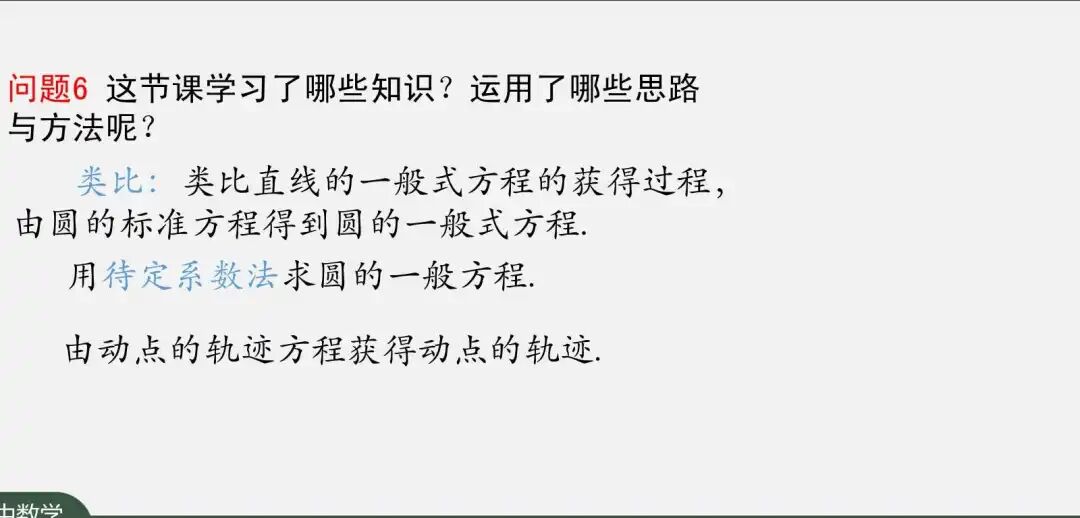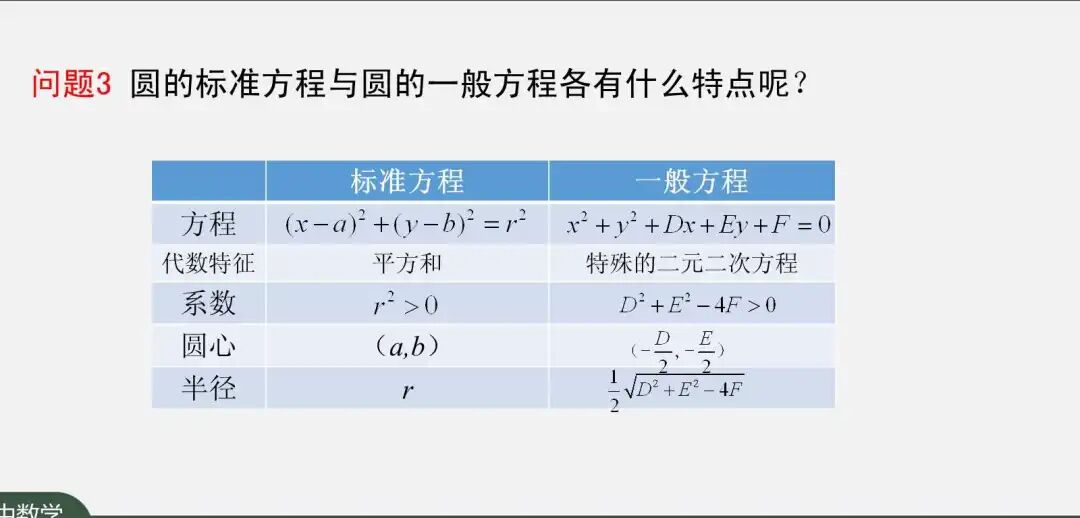 ⑴归纳知识,有利于学生理清知识脉络. ⑵强调的概念的本质,让学生理解记忆圆的一般方程的代数特征. ⑶深化学生对圆的一般方程的理解.