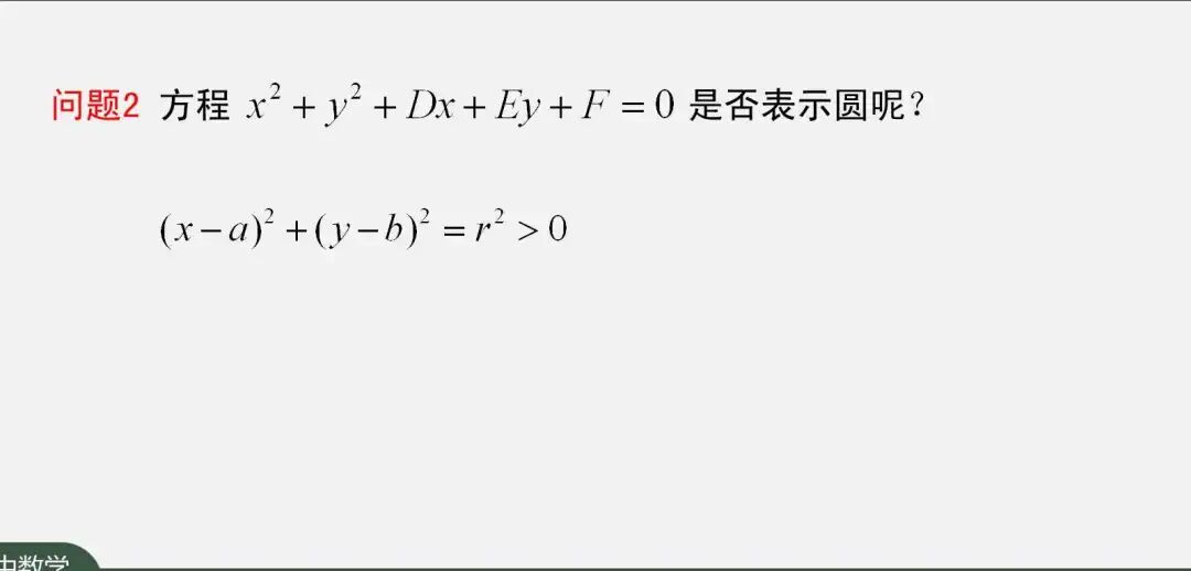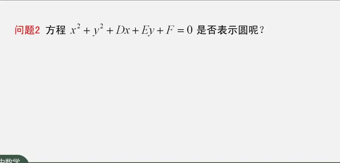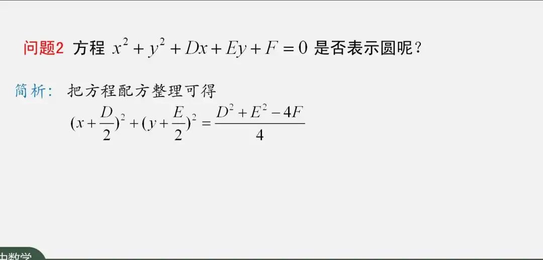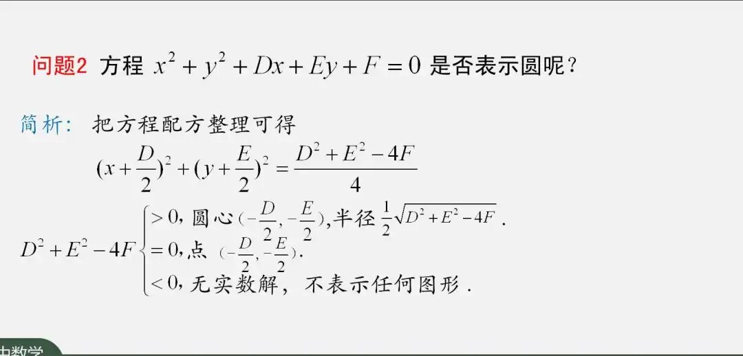 当时,方程①只有实数解,所以表示一个点(-D/2,-E/2);