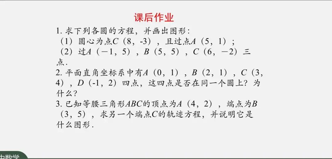语文数学英语物理化学生物史地政治道德与法治美术音乐科学全部课程 ↓知识点: 任何一个圆的方程都可以写成下面的形式: x²+y²+Dx+Ey+F=0① 将①配方得: ②(x+D/2)²+(y+E/2)²=D²+E²-4F/4 当时,方程①表示以(-D/2,-E/2)为圆心,以为半径的圆; 当时,方程①只有实数解,所以表示一个点(-D/2,-E/2); 当时,方程①没有实数解,因此它不表示任何图形. 故当时,方程①表示一个圆,方程①叫做圆的一般方程. 圆的标准方程的优点在于它明确地指出了圆心和半径,而一般方程突出了方程形式上的特点: (1)和的系数相同,且不等于0; (2)没有xy这样的二次项. 以上两点是二元二次方程表示圆的必要条件,但不是充分条件. 要求出圆的一般方程,只要求出三个系数D、E、F就可以了.视频教学:练习:1.若方程ax2+ay2-4(a-1)x+4y=0表示圆,则实数a的取值范围是( )A.R B.(-∞,0)∪(0,+∞)C.(0,+∞) D.(1,+∞)2.已知圆的圆心为(-2,1),其一条直径的两个端点恰好在两坐标轴上,则这个圆的方程是( )A.x2+y2+4x-2y-5=0 B.x2+y2-4x+2y-5=0C.x2+y2+4x-2y=0 D.x2+y2-4x+2y=03.圆x2+y2-2x+4y+3=0的圆心到直线x-y=1的距离为( )A.2 B. C.1 D.4.已知圆C的圆心坐标为(2,-3),且点(-1,-1)在圆上,则圆C的方程为( )A.x2+y2-4x+6y+8=0 B.x2+y2-4x+6y-8=0C.x2+y2-4x-6y=0 D.x2+y2-4x+6y=05.圆C:x2+y2+4x-2y+3=0的圆心是 .半径是 . 课件: 教案:课题圆的一般方程课型新授课课时1课时授课时长45分钟授课题目(章,节)第四章第一节4.2.1圆的一般方程教材及参考书目人教A版高中数学实验教科书必修2●教学目的与要求 一、知识目标:(1)理解记忆圆的一般方程的代数特征。 (2)掌握方程表示圆的条件。二、能力目标:(1)能应用配方法将圆的一般方程化为圆的标准方程。 (2)能应用待定系数法求圆的一般方程。 (3)能应用代入法求一般曲线的方程。 (4)培养探索发现及分析解决问题的能力。三、情感目标:(1)培养学生勇于探索的精神。 (2)渗透数形结合、化归与转化等数学思想方法,提高学生的整体素质。●教学重点 圆的一般方程的代数特征、一般方程与标准方程的互化、待定系数法求圆的一般方程的步骤●教学难点 圆的一般方程和代入法的掌握、应用●教学方法师生合作式探究 诱导启发式教学●教学辅助 多媒体教学平台 CAI课件●教学过程与时间分配 一、复习提问,引入课题 (3 分钟) 二、探索研究,讲授新课 (22分钟) 三、例题讲解,对应练习 (16分钟) 四、课堂小结,反馈回授 (3 分钟) 五、分层作业,巩固提高 (1 分钟)4.2.1圆的一般方程教学基本内容设计意图一、复习提问,引入课题 问题:求过三点(0,0),(1.1),(4,2)的圆的方程?【师生互动】学生在教师指导下展开小组讨论,回顾旧知识,最后得出运用圆的知识很难解决问题。因为圆的标准方程很麻烦,用直线的知识解决又有其简单的局限性。于是老师提问,有没有其他的解决方法呢?带着这个问题我们共同研究圆的一般方程。【辅助手段】:多媒体课件幻灯片展示问题。二、探索研究,讲授新课请同学们写出圆的标准方程:、圆心(a,b)、半径r把圆的标准方程展开,并整理:取D=-2a E=-2b F=这个方程就是圆的方程.反过来给出一个形如的方程,它表示的曲线一定是圆吗? 把配方得: 【师生互动】配方和展开由学生完成,教师最后展示结果。问题:这个方程是不是表示圆?⑴当﹥0时,方程表示以(-,)为圆心,以为半径的圆.⑴以复习回顾的形式提出新难题,引出新课程,指出本节课的主要内容.⑵质疑提问,小组讨论,提高了学生学习的兴趣.⑴学生动笔、思考,老师引导、启发,让学生学会独立分析问题,解决问题,初步体会数学的魅力.⑵引导学生自己探索寻找圆的一般方程在什么时候表示圆,形成分类讨论、等价转化等数学思想,培养学生思维的多样性、创造性,体验成功解决问题的喜悦.⑶通过对一个方程的讨论,得出圆的一般方程,并指出不是所有的方程都可以表示圆。使得学生的认识不断加深,同时教学基本内容设计意图⑵当=0时,方程只有实数解,即只表示一个点(,).⑶当﹤0时,方程没有实数解,因此它不表示任何图形.【师生互动】学生在教师的引导下对方程分类讨论,最后师生共同总结出3种情况,即圆的一般方程表示圆的条件。【归纳总结】圆的一般方程的特点: ⑴①和的系数相同,都等于1。 ②没有这样的二次项。 ⑵圆的一般方程中有三个特定的系数D、E、F,因此只要求出这三个系数,就能确定圆的一般方程。⑶圆的一般方程是一种特殊的二元一次方程,代数特征明显,圆的标准方程则是几何特征明显。【师生互动】学生小组讨论交流,老师进行课堂巡视指导,引导学生归纳。最后师生共同总结出圆的一般方程的特点。【辅助手段】板书配方和展开过程,多媒体课件幻灯片展示三、例题讲解,对应练习例1 判断下列二元一次方程是否表示圆的方程?如果是,请求出圆的圆心及半径。 ⑴ ⑵分析:方法1 利用配方法将其化为圆的标准形式. 方法2 应用圆的一般方程来解,这里D=-1,E=3,F=.例2 求过三点A(0,0),B(1,1),C(4,2)的圆的方程,并求这个圆的半径长和圆心坐标。分析:根据已知条件,很难直接写出圆的标准方程,而圆的培养思维的严谨性.⑴归纳知识,有利于学生理清知识脉络.⑵强调的概念的本质,让学生理解记忆圆的一般方程的代数特征.⑶深化学生对圆的一般方程的理解.⑴同步练习,检测学生的掌握情况,及时回授,强化知识点的应用.⑵加深对所学知识的理解应用,使学生掌握基础知识,有利于学生