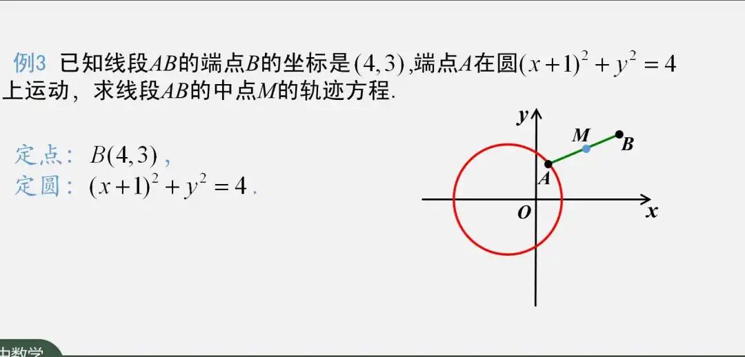 【教师讲解】:设点M的坐标是( , ),点A的坐标是( , ),由于点B的坐标是(4,3),且M是线段AB的中点,所以有: ,![]() 于是有 ,![]() 因为点A在圆 上运动,所以点A的坐标满足方程![]() 即 ![]() 把①代入②,得: ![]() 整理,得: ![]() 所以,点M的轨迹是以( , )为圆心,半径是1的圆. 【归纳总结】运用代入法求轨迹方程的步骤 ⑴建立适当的坐标系,用有序数对(x,y)表示曲线上任意一点M的坐标. ⑵写出适合条件的点M的集合. ⑶列出方程 . ⑷化方程 为最简形式. 【课堂练习】 1 求下列各方程表示的圆的圆心坐标和半径长 ⑴ ⑵![]() ⑶![]() 2 判断下列方程分别表示什么图形 ⑴ ⑵![]() ⑶![]() |
