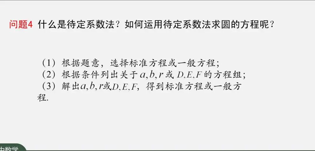 ●教学重点 圆的一般方程的代数特征、一般方程与标准方程的互化、待定系数法求圆的一般方程 的步骤