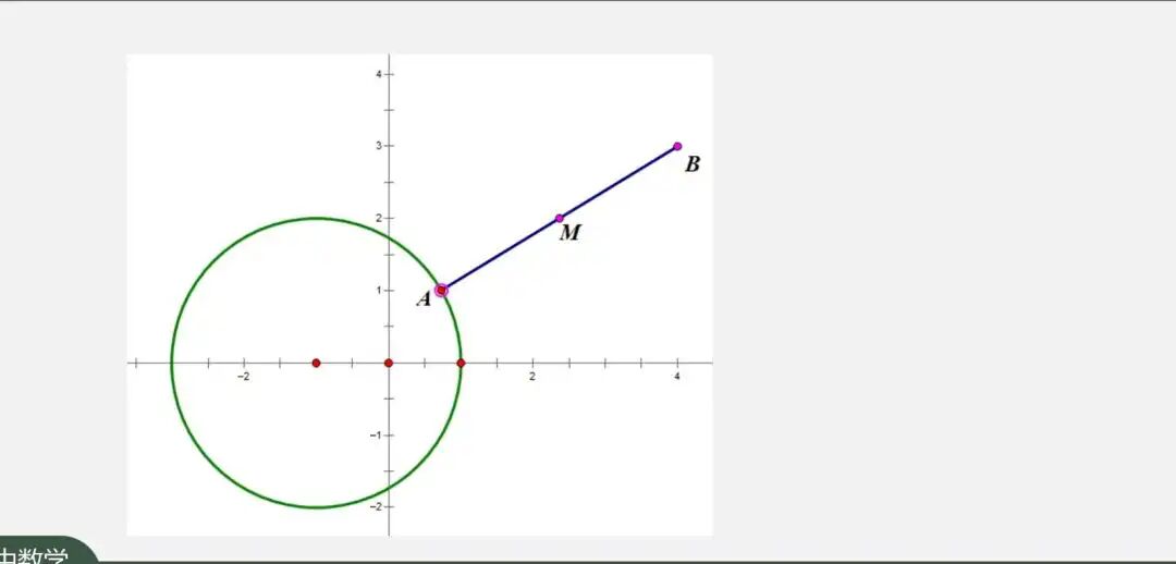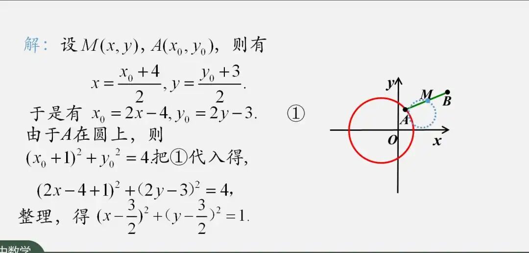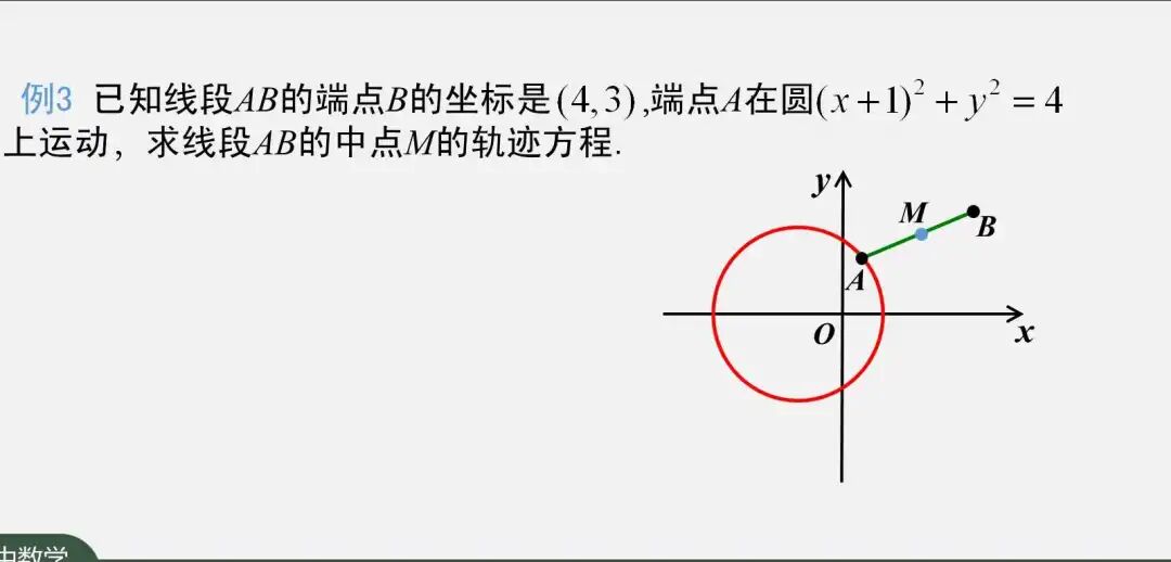 一般方程则只需确定三个系数,而条件给出了三个坐标,不妨试着先写出圆的一般方程。 【教师讲解】设圆的方程为![]() ∵A(0,0),B(1,1),C(4,2)在圆上,所以它们的坐标是方程的解,代入方程得到: 即D=-8 E=6 F=O ∴所求的方程为![]() =5、 =4、 =-3 ∴圆心坐标为(4,-3) 或将 化为圆的标准方程: ![]() 【归纳总结】应用待定系数法的一般步骤 ⑴根据条件,选择是标准方程还是一般方程。 ⑵根据条件列出关于a、b、r或D、E、F的方程组。 ⑶解出a、b、r或D、E、F并将其代入其相关方程。 例3 已知线段AB的端点B的坐标是(4,3),端点A在圆上 运动,求线段AB的中点M的轨迹方程。 分析:如图点A运动引起M运动,而点A在圆上运动点A 的坐标满足方程 ,建立点M与点A的关系, 就可以建立点M的坐标满足的条件,也就出了M的方程。 ![]()