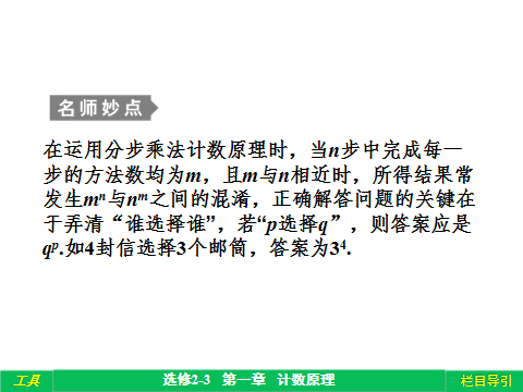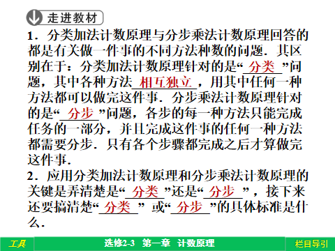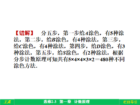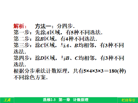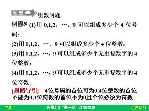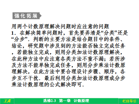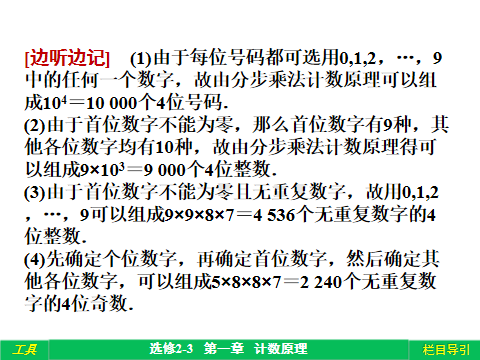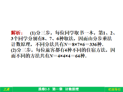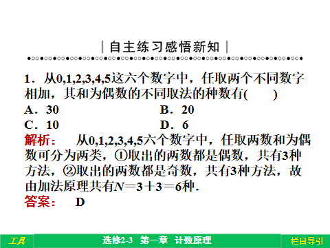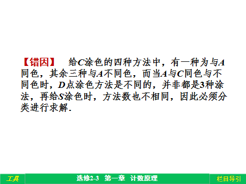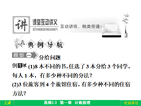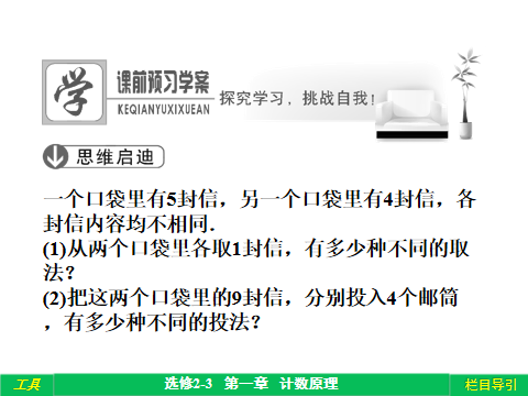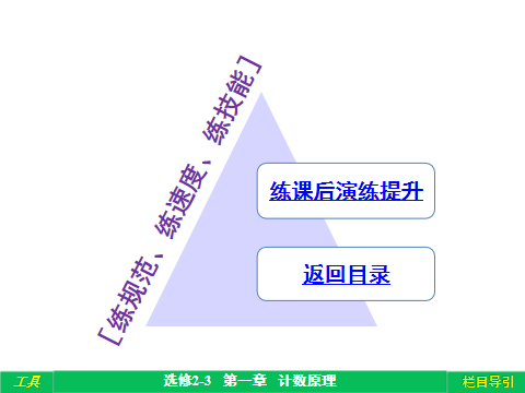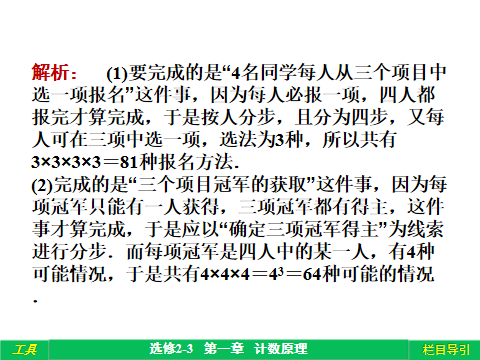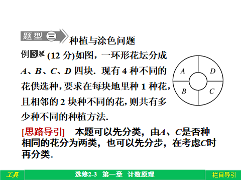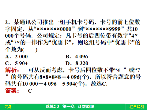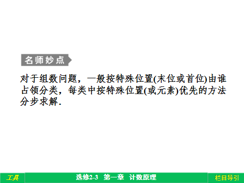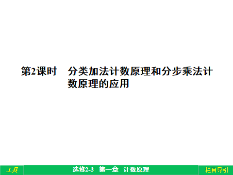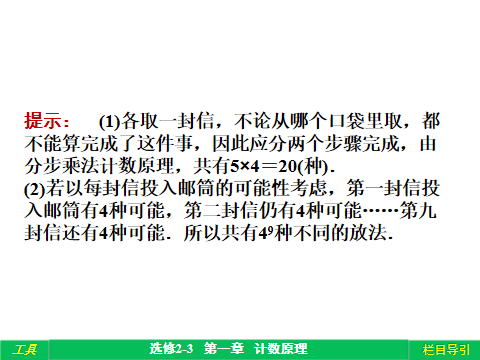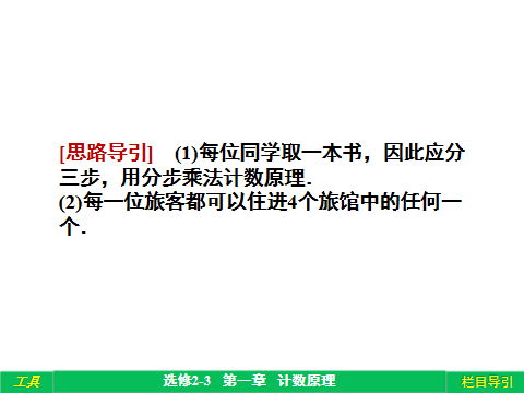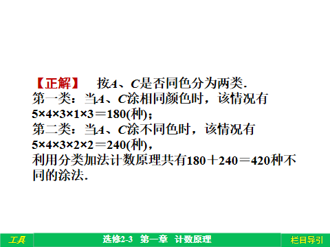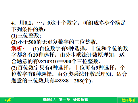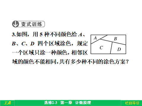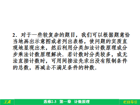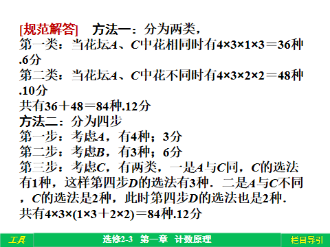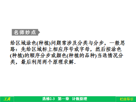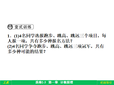 语文数学英语物理化学生物史地政治道德与法治美术音乐科学全部课程 ↓视频教学:练习:1.如图,小圆圈表示网络的结点,结点之间的连线表示它们有网络联系,连线上标注的数字表示该段网线单位时间内可以通过的最大信息量,现从结点A向结点B传递信息,信息可以分开沿不同路线同时传递,则单位时间内传递的最大信息量为( ) A.26 B.24 C.20 D.192.从0,1,2,…,9这10个数字中,任取两个不同数字作为平面直角坐标系中点(a,b)的坐标,能够确定不在x轴上的点的个数是( )A.100 B.90 C.81 D.723.在由0,1,2,3,4,5所组成的没有重复数字的四位数中,能被5整除的有( )A.512个 B.192个C.240个 D.108个4.某体育彩票规定:从01至36共36个号中抽出7个号为一注,每注2元.某人想从01至10中选3个连续的号,从11至20中选2个连续的号,从21至30中选1个号,从31至36中选1个号组成一注,则这个人把这种特殊要求的号买全(每组号买一注),需要( )A.3 360元 B.6 720元C.4 320元 D.8 640元5.五个工程队承建某项工程的5个不同的子项目,每个工程队承建1项,其中甲工程队不能承建1号子项目,则不同的承建方案有 种. 课件:教案:一、知识提要:1、分类相加原理:2、分步相乘原理:3、排列及排列数公式4、组合及组合数公式5、递推方法二.典例精析例1、一项数学测验共有三道题目,每道都可得1到10分的整数分数。若参加此项测验的学生的得分都大于15分,且任意两位学生都至少有一道题目的得分不相同。请问至多有多少位学生参加此项测验?例2、(1)墙上有一个的区域,现用红、白、蓝三种颜色的的瓷砖铺满它,且相同颜色的瓷砖不能有公共边,请问有多少种铺法?(2)请问 共有多少个因子是完全平方数?(3)请问不超过20112012且只用到数码0、1、2的正整数共有多少个?(4)一个圆上的24个点把圆周等分成24份,请问总共有多少个正三角形满足至少有两个顶点在以上这24个点之中?例3.(1)平面上的n条直线最多将平面分成多少多少部分? (2)空间n个平面将空间最多分成多少部分?例4、(1)m位的二进制数中,恰有r个零的二进制数有多少个?(2)设是集合中所有的数从小到大排列成的数列,已知=1160,求k。例5、 圆周上有八个点,每两点之间都连线段,以这些线段为边可组成三角形,其中三个顶点都在圆内的三角形有多少个?所有的三角形共有多少个?例6.平面上的64个点组成一个的点阵。同一行或同一列上相邻两点间的距离都是1cm。请问以这64个点中的4个点为顶点且面积为12的长方形有多少个?例7、平面上给定六个点(联结这些点的直线互不平行,互不垂直,也不重合),过每一点向其余五点中任意两点的连线作垂线,则这些垂线的交点最多有多少个?三、2017年国际数学竞赛培训------《同步训练》1.某次乒乓球单打比赛,原计划每两名选手比赛一场,但有3名选手各比赛了2场后退出了比赛,这样全部比赛一共进行了50场,那么上述3名选手之间比赛的场数是多少?2、(1)形如n= (i、j、k为非负整数)的整数中,满足的个数有___________(2)内角的度数为整数的正n边形的个数是( )A.18 B、20 C、22 D、24(3)、三边上分别有l、m、n个点,由每个顶点与其对边上的点连线,若这些线中无三线共点,问它们把划分成___________块?3、(1)形如n= (i、j、k为非负整数)的整数中,满足的个数有___________(2)内角的度数为整数的正n边形的个数是( )A.18 B、20 C、22 D、244.在一次共有10位选手参加的国际象棋比赛中,每位选手必须与其他选手恰好对弈一局。经过数局比赛后,发现任意三位选手之间都至少有两人尚未对弈。问:截至此时,比赛最多已赛过多少局?(25)5、将一个的棋盘中的8个小方格染成黑色,使得每行、每列都恰好有两个黑色方格,则有多少种不同的染法?6、已知15条射线有共同的端点。请问这15条射线最多能构成多少个钝角?(任何两条射线所构成的角取为小于或等于的那个角)(75个)7、圆被分成n个不相等的扇形,并且用红、黄、蓝三色染色,但相邻的扇形的颜色不相同,这样的染色方法有多少种?高中生学习推荐:高中语文(微课+课件+教案+考点)汇总高中英语(微课+课件+教案+考点)汇总高中化学(微课+课件+教案+考点)汇总高中物理(微课+课件+教案+考点)汇总高中数学(微课+课件+教案+练习题)汇总高中生物(微课+课件+教案+练习题)汇总高中历史(必修+选修)微课精讲+考点汇总高中政治(必修+选修)微课精讲+考点汇总高中地理(必修+选修)微课精讲+考点汇总 图文来自网络,版权归原作者,如有不妥,告知即删点击阅读原文下载全册PPT课件动画教案习题整套资料