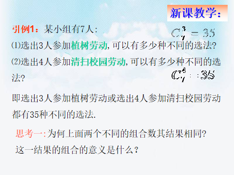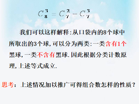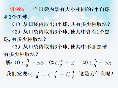 设计意图:由两个事例,让学生感知组合数性质的深层次的含义,明白其实际意义,才能有效地帮助学生记住这个性质.其次,由特殊例子归纳猜想一般性的结论,提高学生学习数学的兴趣.