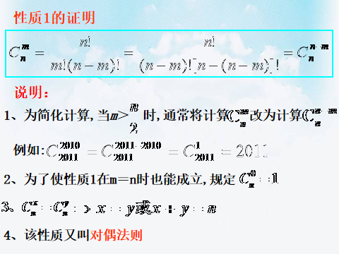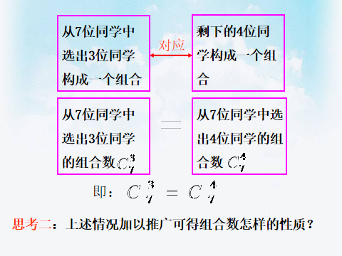 设计意图:通过学生个别学习,让学生自己抽象概括,揭示问题的本质。这里教师的任务是:对学生知识上进行适当的补遗,思维上进行恰当的启迪,方法上进行恰当的点拨,鼓励学生积极、主动地探究,以较高的热情、顽强的意志,完成整个探究过程。从而总结出组合数的第一个性质:.