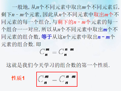 从n个不同元素中取出m(m≤n)个元素的所有不同组合的个数,叫做从n个不同元素中取出m个元素的组合数,记。