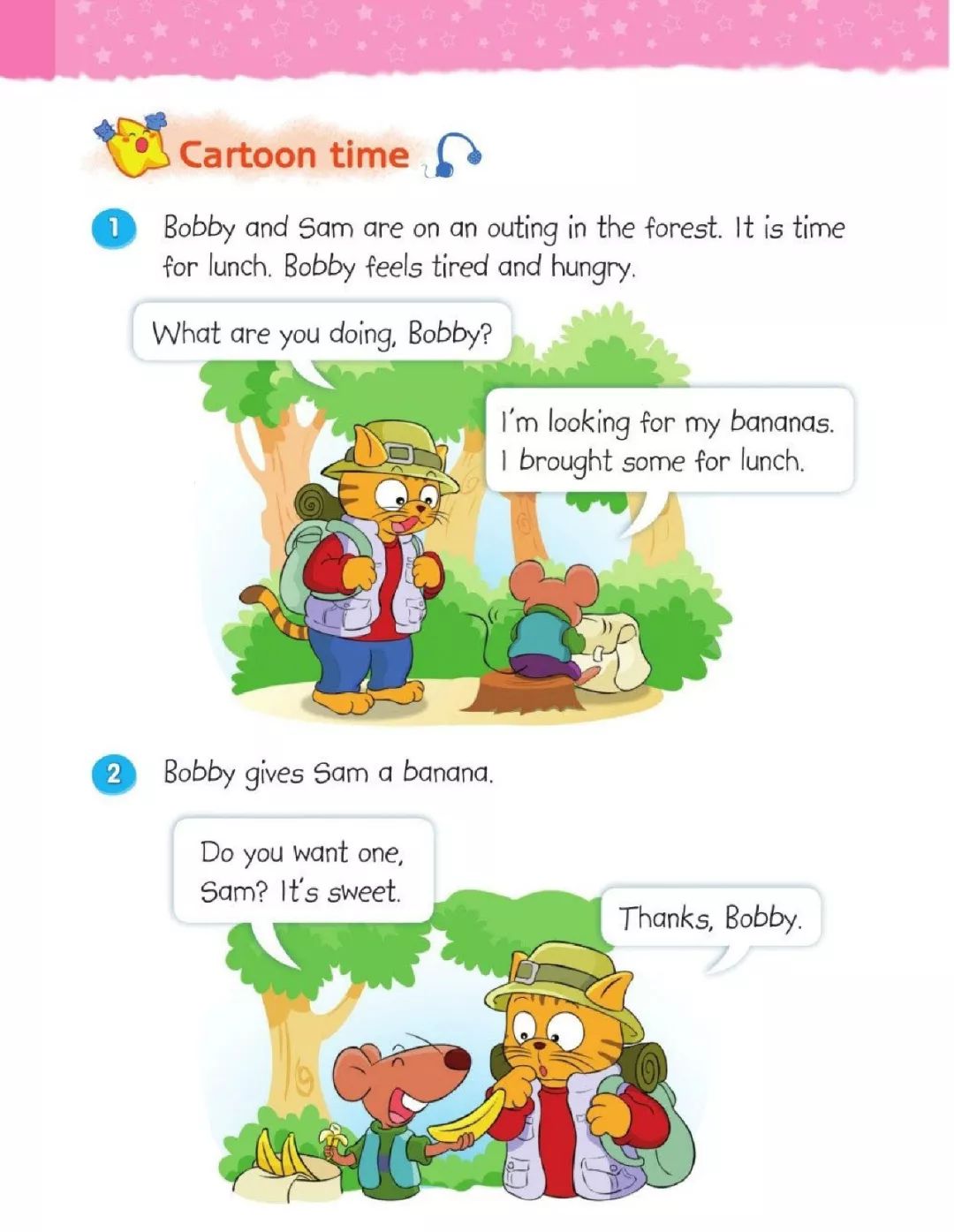 鲍比和山姆外出去森林里游玩。到吃午饭的时间了。鲍比觉得又累又饿。